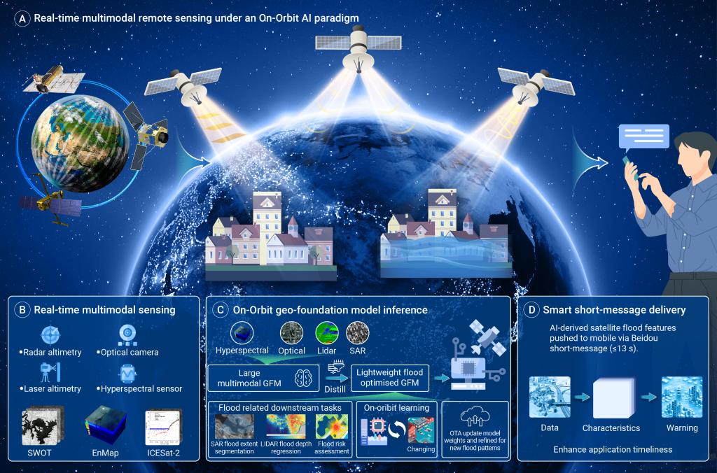 图1 基于下一代多模态遥感与星上人工智能的洪水立体智能监测新范式。A)星上人工智能驱动的实时多模态遥感框架。在该范式下,新一代洪水智能监测对传感器体系、模型结构与数据传输方式提出了新的需求与挑战;B)实时多模态协同感知。通过多传感器协同观测,实现洪水淹没范围、水面高程及淹没深度的同步监测;C)星上地理基础模型推理。基于轻量化、多模态、多任务深度学习框架,实现星上信息智能解译与即时推理;D)智能短报文传输。利用北斗短报文技术,通过带宽优化路径,将关键洪水信息高效传输至移动终端。