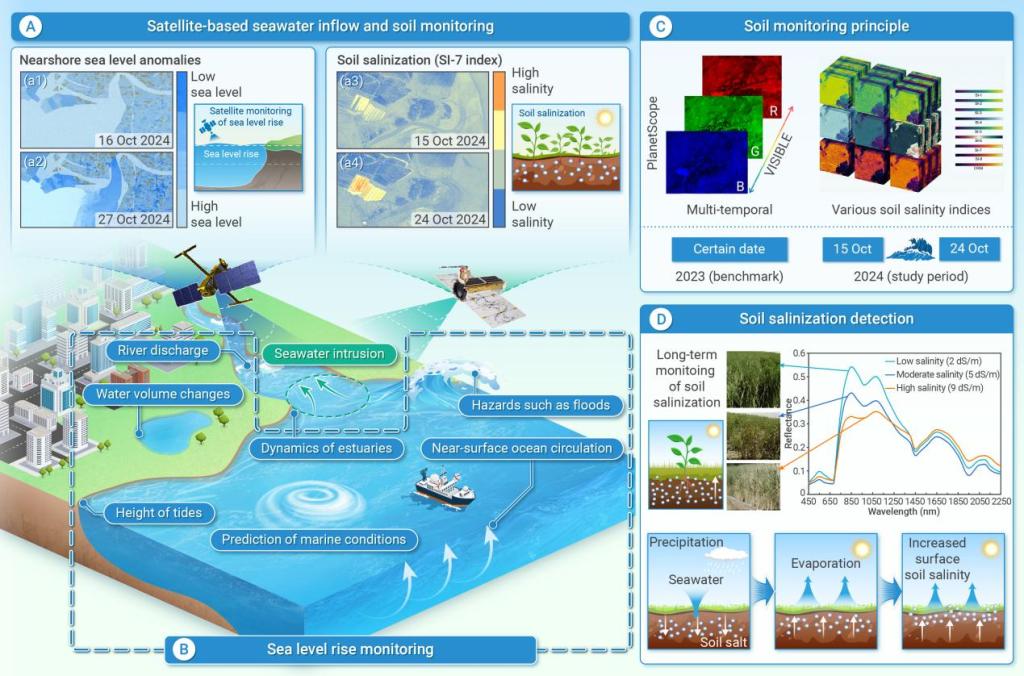 图1 基于卫星遥感视角的海水入侵监测框架。A)基于卫星的海水入流监测。通过融合SWOT KaRIn高程数据与Sentinel-2A多光谱观测结果,反演得到辽河口2024年10月海平面上升1.8 m的变化特征;B)土壤监测原理。多光谱传感器可捕捉海水入侵引起的土壤水分变化及早期盐分积累信号;C)土壤盐渍化监测。展示入侵事件后盐分增加与植被胁迫的空间分布格局,突出海水入侵驱动的生态环境变化;D)海平面上升监测。利用 SWOT KaRIn 探测入侵前后亚米级海表高度变化,识别向陆地推进的海水锋面位置。