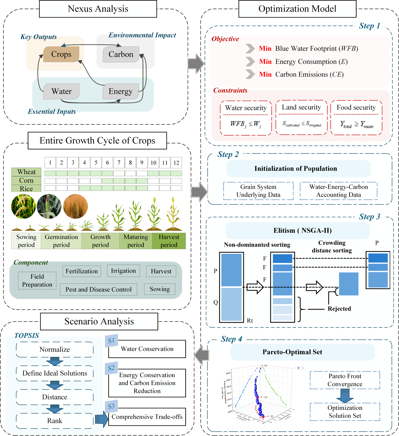 伴随着“双碳”目标与粮食安全战略的同步推进,中国粮食系统正面临资源约束与环境压力双重挑战。针对当前缺乏对区域尺度作物种植结构在水资源、能源消耗与碳排放协同控制下系统优化的研究,研究团队构建了面向“节水–节能–低碳”目标的综合优化框架。以水稻、小麦和玉米种植结构为决策变量,并纳入水、土地、经济及粮食安全等多重约束,对京津冀地区主粮种植结构进行优化。结果表明,主粮种植结构优化能够在保障粮食安全前提下有效降低资源环境压力,区域调整方向具有一定共性,但不同地市路径存在明显差异。该研究为区域粮食系统水能碳协同调控与农业结构优化提供了方法支撑。